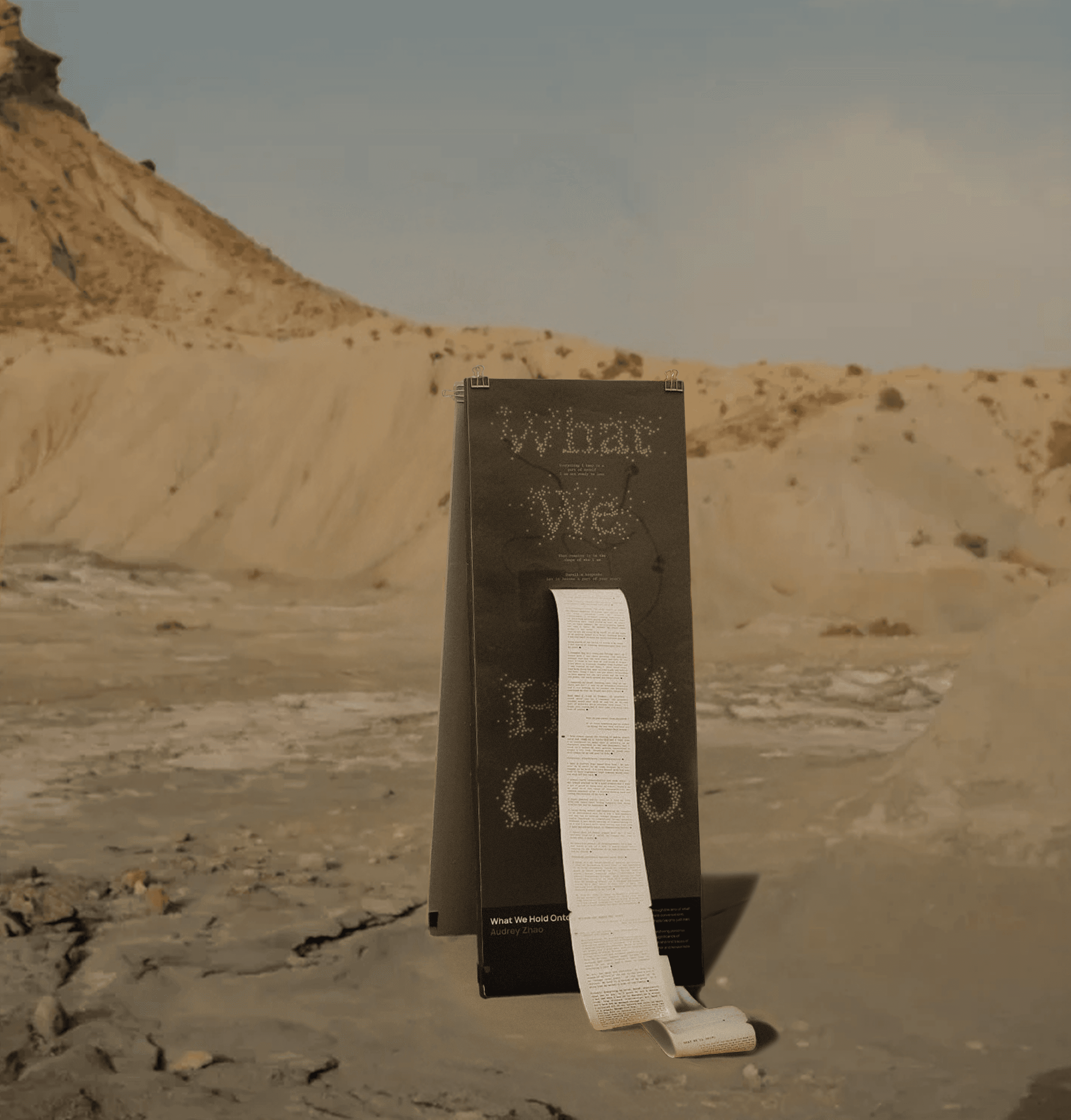 What We Hold Onto is a collection of 17 intimate conversations about mementos we hold onto, though often forget. I took inspiration from the form of the A-frame board as a monolith, an object defined by its permanence in a moving landscape. Part of a collective exhibition Character: Lived, Tested, and Exposed”, challenging us to give the word “character” a visual voice.